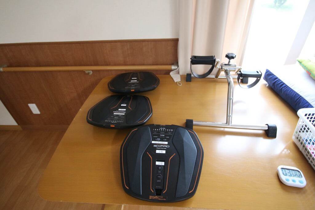 - デイサービスでは、機能訓練として、このような機器を用意しています。利用者の皆さんもよく使っています。