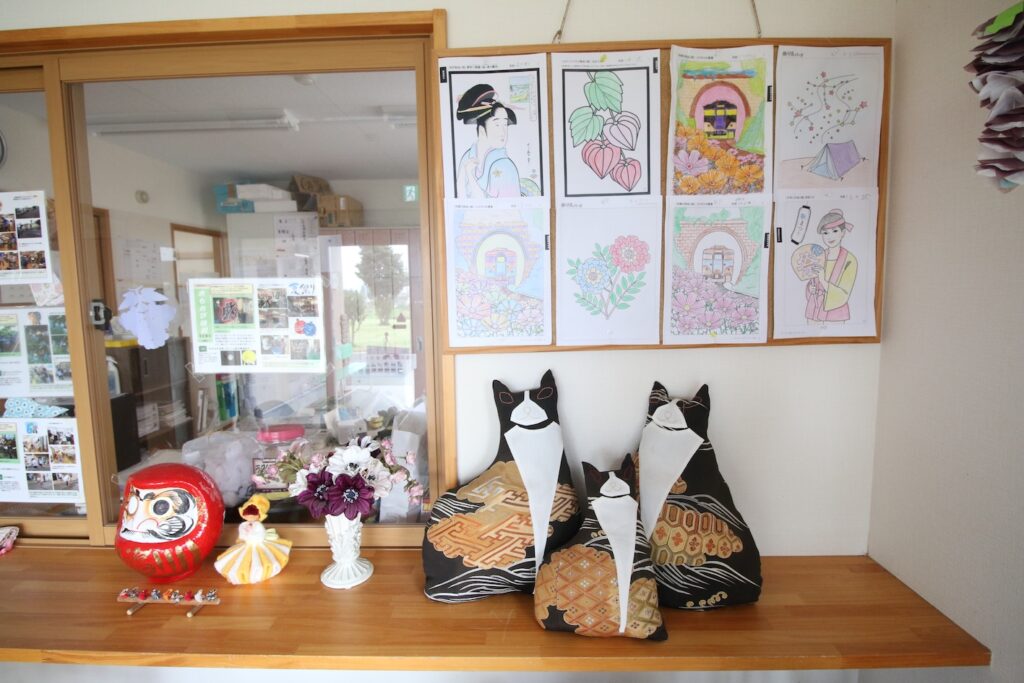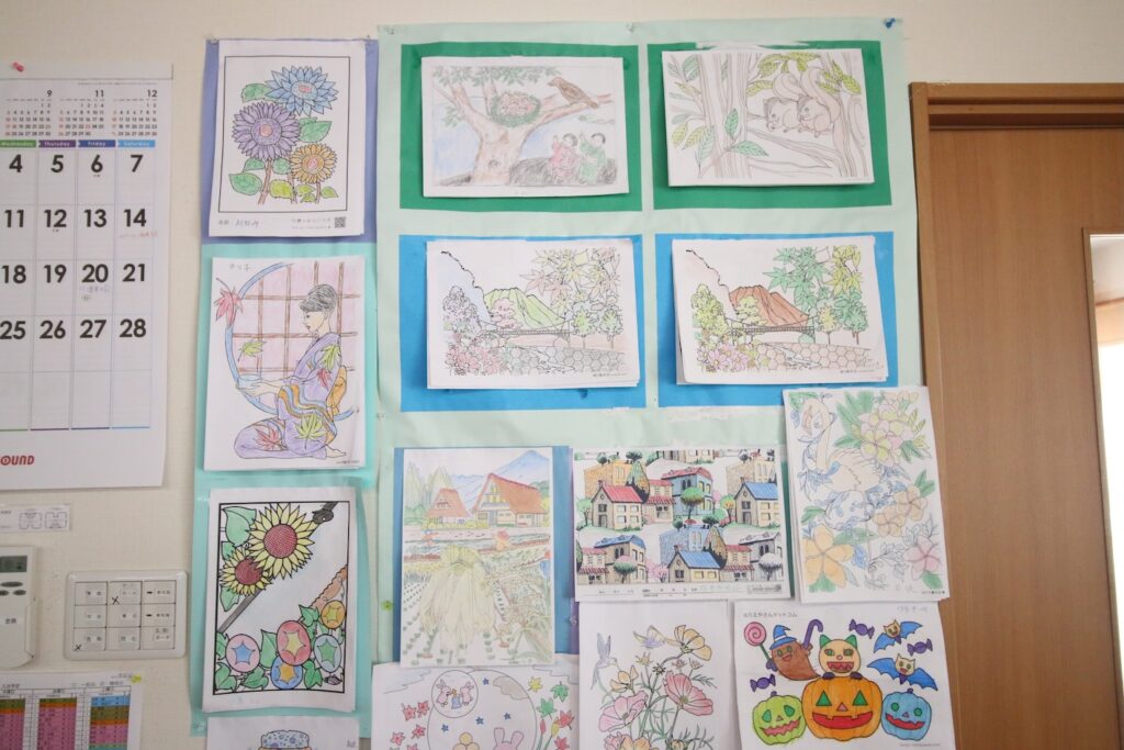 - 利用者が書いた塗り絵の作品を飾っています。年に数回、塗り絵大会を行っていますので、利用者の皆さんも張り切って書いています。